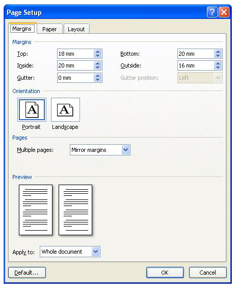 Margins for the inside edge of a paperback book should be approximately 20mm and for the outside edge approximately 16mm and these can be increased for the larger books sizes. You will also need to select mirror margins in the multiple pages drop-down.Top and bottom margins can be set at 18mm and 20mm respectively. SEE IT