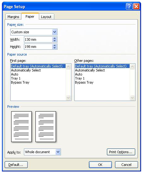 Select the ‘Paper’ tab and change the paper size settings to the same as your chosen book size. You may have to choose custom size and then enter the dimensions in the boxes provided. Make sure the orientation (portrait or landscape) is correct. SEE IT