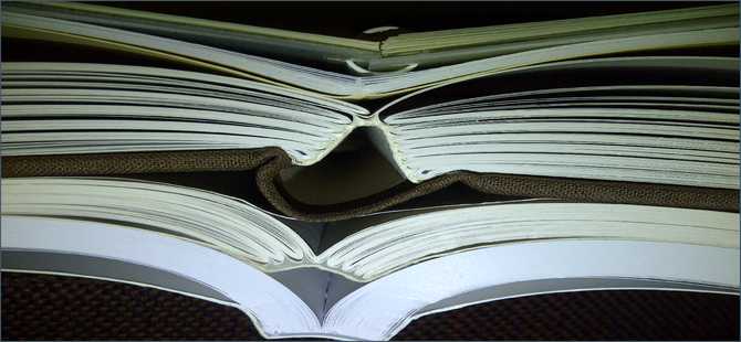 Similar in appearance to the above, but with the pages folded and sewn together with thread in sections and then glued to give a much more permanent bind and the ability to lay flat when opened. Recommended for books where frequent use and therefore durability is a must.
